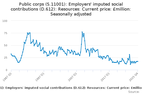 Download this time seriesPublic corps (S.11001): Employers' imputed social contributions (D.612): Resources: Current price: £million: Seasonally adjusted