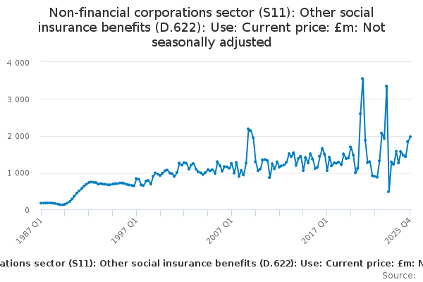 Download this time seriesNon-financial corporations sector (S11): Other social insurance benefits (D.622): Use: Current price: £m: Not seasonally adjusted