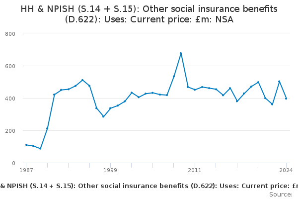 Download this time seriesHH & NPISH (S.14 + S.15): Other social insurance benefits (D.622): Uses: Current price: £m: NSA