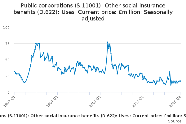 Download this time seriesPublic corporations (S.11001): Other social insurance benefits (D.622): Uses: Current price: £million: Seasonally adjusted