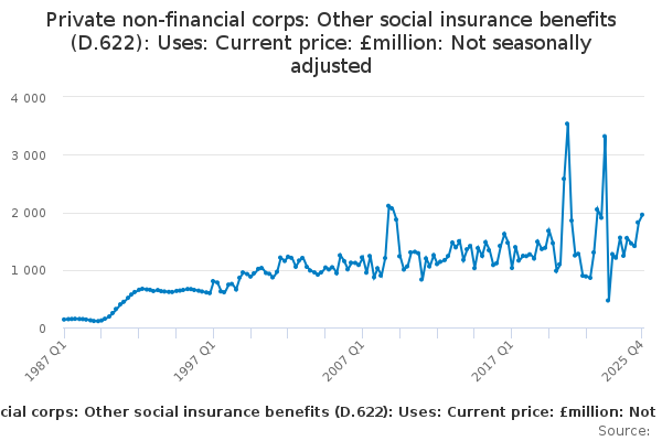 Download this time seriesPrivate non-financial corps: Other social insurance benefits (D.622): Uses: Current price: £million: Not seasonally adjusted