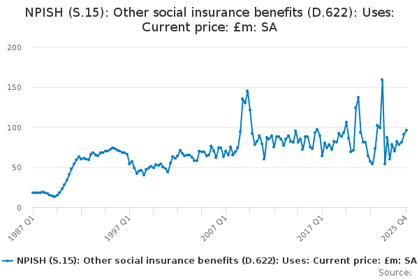 Download this time seriesNPISH (S.15): Other social insurance benefits (D.622): Uses: Current price: £m: SA