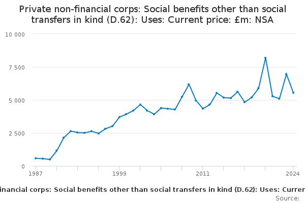 Download this time seriesPrivate non-financial corps: Social benefits other than social transfers in kind (D.62): Uses: Current price: £m: NSA