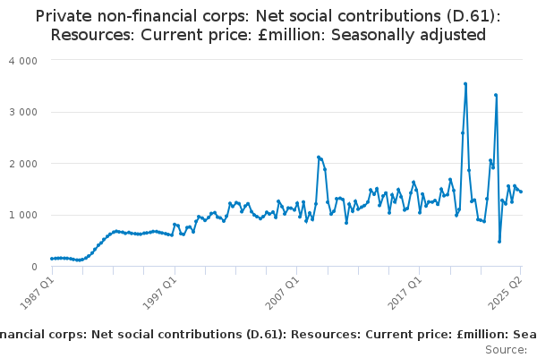 Download this time seriesPrivate non-financial corps: Net social contributions (D.61): Resources: Current price: £million: Seasonally adjusted