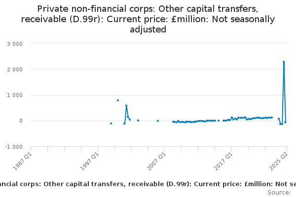 Download this time seriesPrivate non-financial corps: Other capital transfers, receivable (D.99r): Current price: £million: Not seasonally adjusted