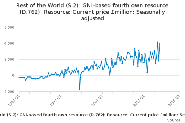 Download this time seriesRest of the World (S.2): GNI-based fourth own resource (D.762): Resource: Current price £million: Seasonally adjusted