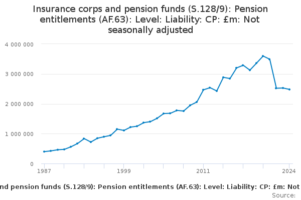 Download this time seriesInsurance corps and pension funds (S.128/9): Pension entitlements (AF.63): Level: Liability: CP: £m: Not seasonally adjusted