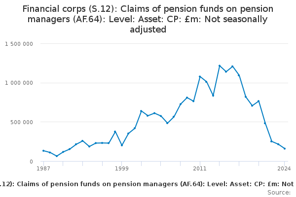 Download this time seriesFinancial corps (S.12): Claims of pension funds on pension managers (AF.64): Level: Asset: CP: £m: Not seasonally adjusted