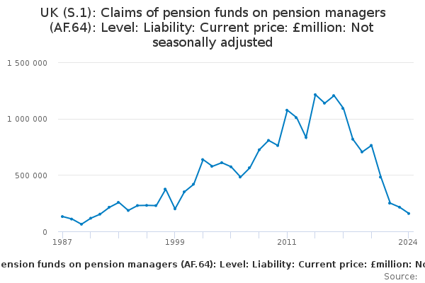 Download this time seriesUK (S.1): Claims of pension funds on pension managers (AF.64): Level: Liability: Current price: £million: Not seasonally adjusted