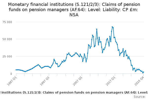 Download this time seriesMonetary financial institutions (S.121/2/3): Claims of pension funds on pension managers (AF.64): Level: Liability: CP £m: NSA