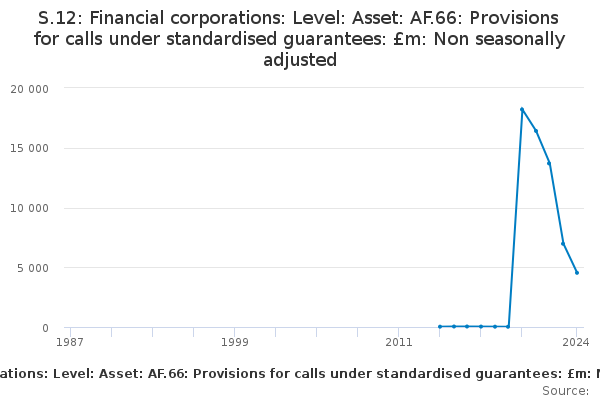 Download this time seriesS.12: Financial corporations: Level: Asset: AF.66: Provisions for calls under standardised guarantees: £m: Non seasonally adjusted
