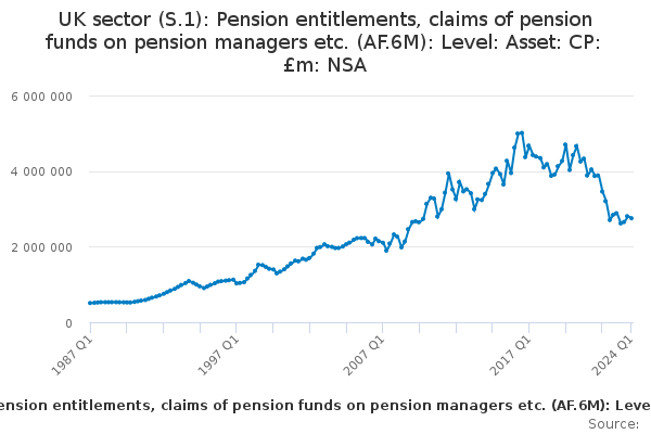 Download this time seriesUK sector (S.1): Pension entitlements, claims of pension funds on pension managers etc. (AF.6M): Level: Asset: CP: £m: NSA