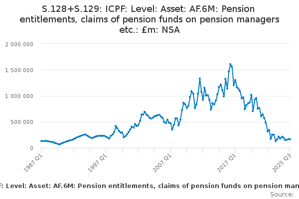 Download this time seriesS.128+S.129: ICPF: Level: Asset: AF.6M: Pension entitlements, claims of pension funds on pension managers etc.: £m: NSA