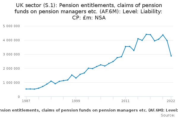 Download this time seriesUK sector (S.1): Pension entitlements, claims of pension funds on pension managers etc. (AF.6M): Level: Liability: CP: £m: NSA