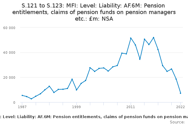 Download this time seriesS.121 to S.123: MFI: Level: Liability: AF.6M: Pension entitlements, claims of pension funds on pension managers etc.: £m: NSA