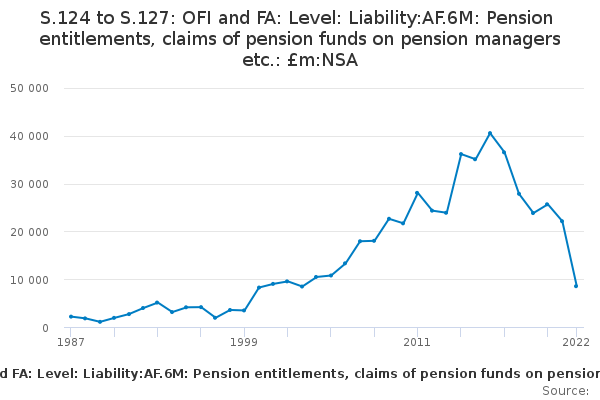 Download this time seriesS.124 to S.127: OFI and FA: Level: Liability:AF.6M: Pension entitlements, claims of pension funds on pension managers etc.: £m:NSA
