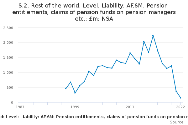 Download this time seriesS.2: Rest of the world: Level: Liability: AF.6M: Pension entitlements, claims of pension funds on pension managers etc.: £m: NSA