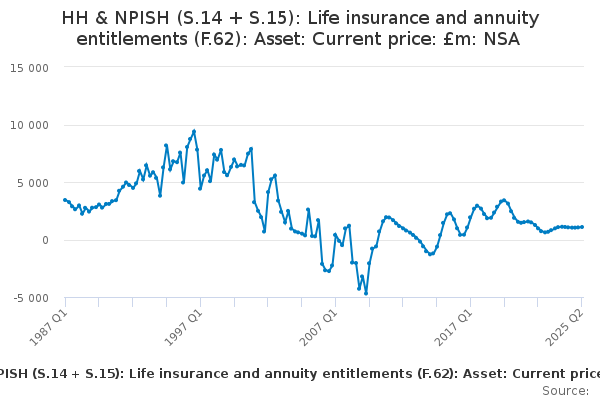 Download this time seriesHH & NPISH (S.14 + S.15): Life insurance and annuity entitlements (F.62): Asset: Current price: £m: NSA