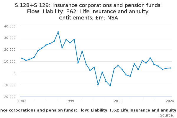 Download this time seriesS.128+S.129: Insurance corporations and pension funds: Flow: Liability: F.62: Life insurance and annuity entitlements: £m: NSA