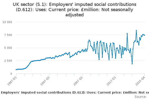 Download this time seriesUK sector (S.1): Employers' imputed social contributions (D.612): Uses: Current price: £million: Not seasonally adjusted
