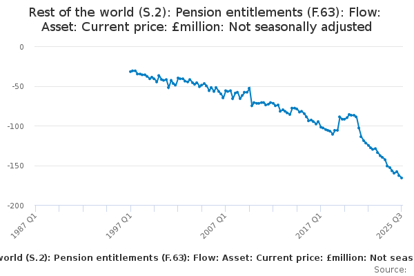 Download this time seriesRest of the world (S.2): Pension entitlements (F.63): Flow: Asset: Current price: £million: Not seasonally adjusted