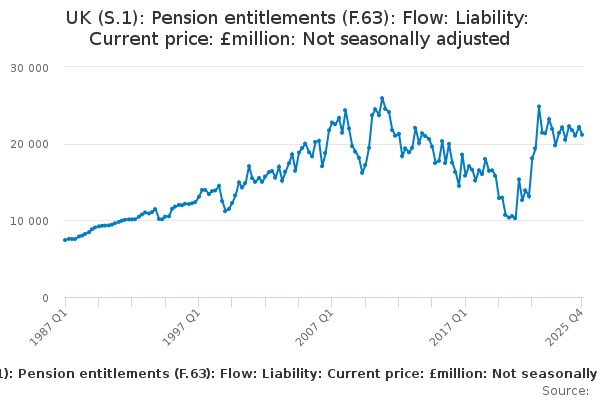 Download this time seriesUK (S.1): Pension entitlements (F.63): Flow: Liability: Current price: £million: Not seasonally adjusted