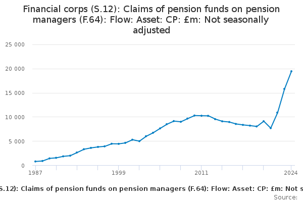 Download this time seriesFinancial corps (S.12): Claims of pension funds on pension managers (F.64): Flow: Asset: CP: £m: Not seasonally adjusted