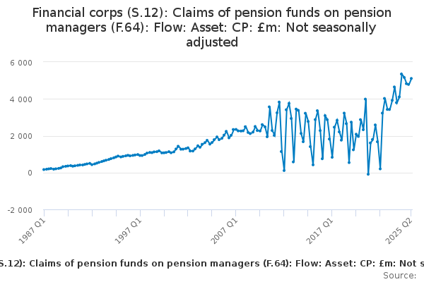 Download this time seriesFinancial corps (S.12): Claims of pension funds on pension managers (F.64): Flow: Asset: CP: £m: Not seasonally adjusted