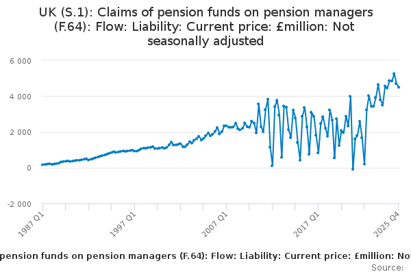 Download this time seriesUK (S.1): Claims of pension funds on pension managers (F.64): Flow: Liability: Current price: £million: Not seasonally adjusted