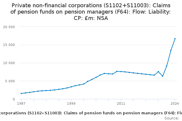 Download this time seriesPrivate non-financial corporations (S1102+S11003): Claims of pension funds on pension managers (F64): Flow: Liability: CP: £m: NSA