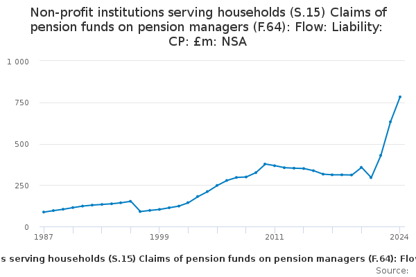 Download this time seriesNon-profit institutions serving households (S.15) Claims of pension funds on pension managers (F.64): Flow: Liability: CP: £m: NSA