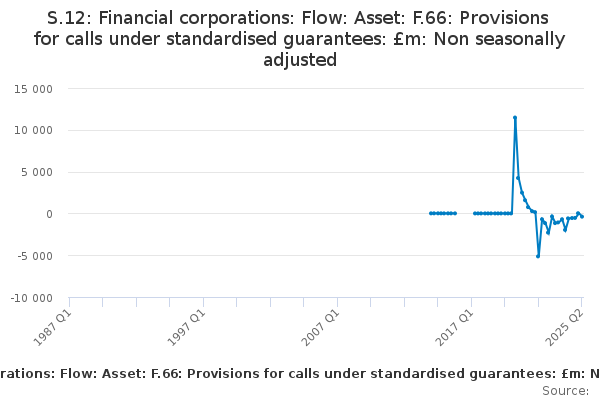 Download this time seriesS.12: Financial corporations: Flow: Asset: F.66: Provisions for calls under standardised guarantees: £m: Non seasonally adjusted