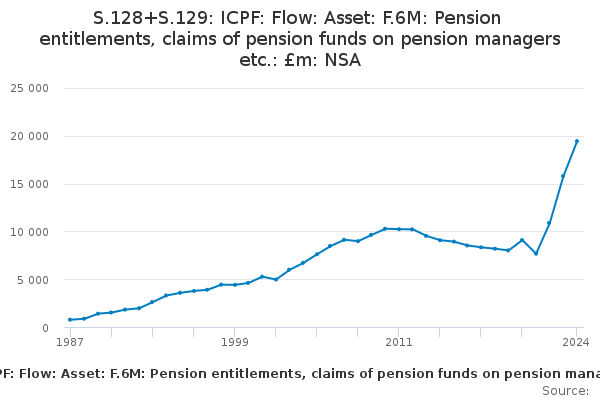 Download this time seriesS.128+S.129: ICPF: Flow: Asset: F.6M: Pension entitlements, claims of pension funds on pension managers etc.: £m: NSA