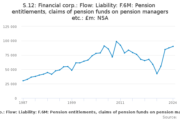 Download this time seriesS.12: Financial corp.: Flow: Liability: F.6M: Pension entitlements, claims of pension funds on pension managers etc.: £m: NSA