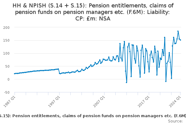 Download this time seriesHH & NPISH (S.14 + S.15): Pension entitlements, claims of pension funds on pension managers etc. (F.6M): Liability: CP: £m: NSA