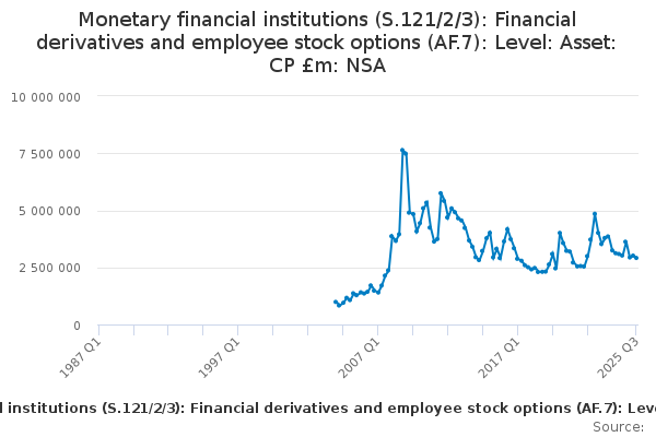 Download this time seriesMonetary financial institutions (S.121/2/3): Financial derivatives and employee stock options (AF.7): Level: Asset: CP £m: NSA