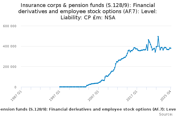 Download this time seriesInsurance corps & pension funds (S.128/9): Financial derivatives and employee stock options (AF.7): Level: Liability: CP £m: NSA