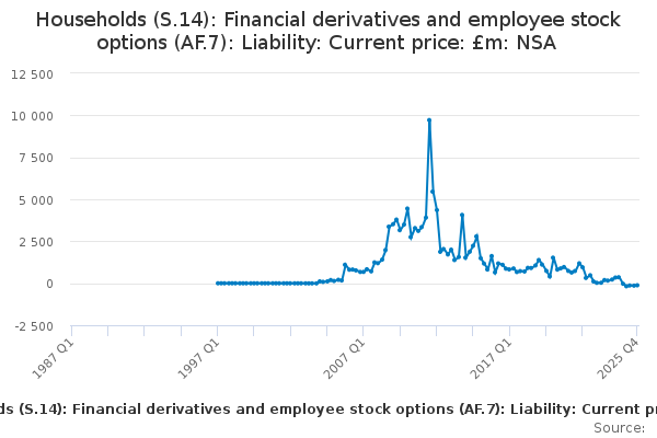 Download this time seriesHouseholds (S.14): Financial derivatives and employee stock options (AF.7): Liability: Current price: £m: NSA