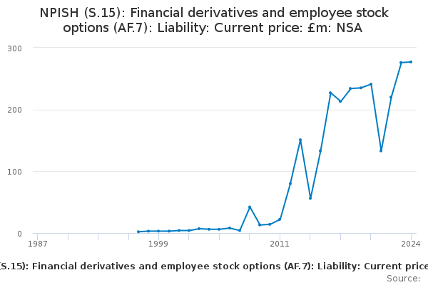 Download this time seriesNPISH (S.15): Financial derivatives and employee stock options (AF.7): Liability: Current price: £m: NSA