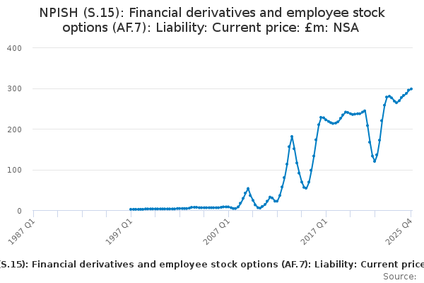 Download this time seriesNPISH (S.15): Financial derivatives and employee stock options (AF.7): Liability: Current price: £m: NSA
