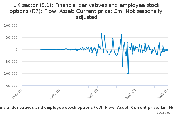Download this time seriesUK sector (S.1): Financial derivatives and employee stock options (F.7): Flow: Asset: Current price: £m: Not seasonally adjusted