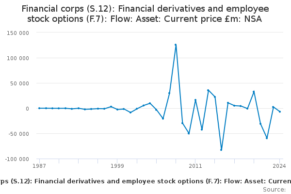 Download this time seriesFinancial corps (S.12): Financial derivatives and employee stock options (F.7): Flow: Asset: Current price £m: NSA