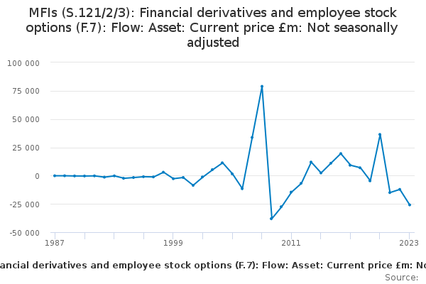 Download this time seriesMFIs (S.121/2/3): Financial derivatives and employee stock options (F.7): Flow: Asset: Current price £m: Not seasonally adjusted