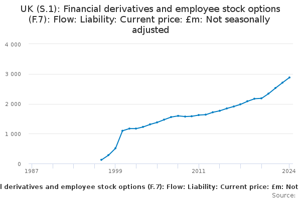 Download this time seriesUK (S.1): Financial derivatives and employee stock options (F.7): Flow: Liability: Current price: £m: Not seasonally adjusted