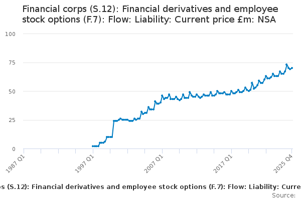 Download this time seriesFinancial corps (S.12): Financial derivatives and employee stock options (F.7): Flow: Liability: Current price £m: NSA