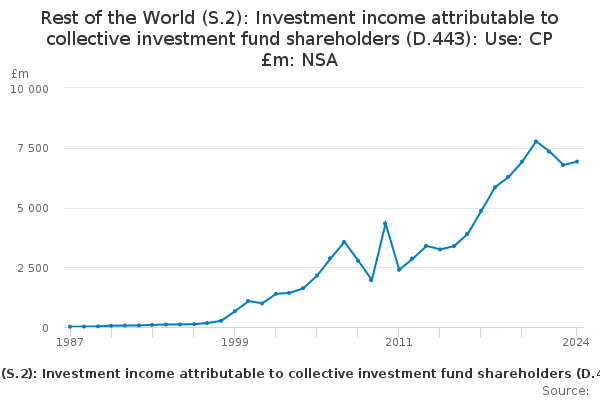 Download this time seriesRest of the World (S.2): Investment income attributable to collective investment fund shareholders (D.443): Use: CP £m: NSA