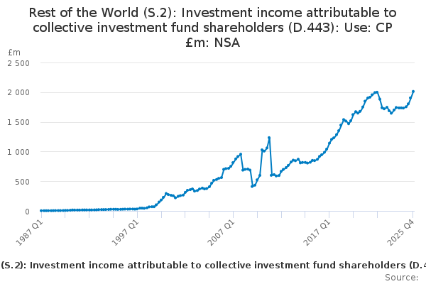 Download this time seriesRest of the World (S.2): Investment income attributable to collective investment fund shareholders (D.443): Use: CP £m: NSA
