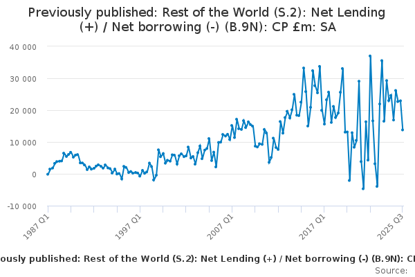 Download this time seriesPreviously published: Rest of the World (S.2): Net Lending (+) / Net borrowing (-) (B.9N): CP £m: SA