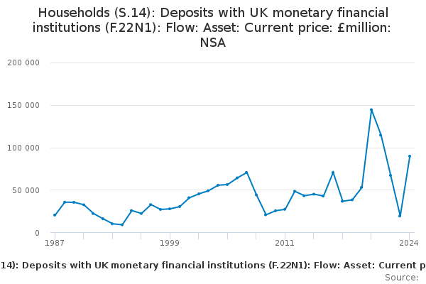 Download this time seriesHouseholds (S.14): Deposits with UK monetary financial institutions (F.22N1): Flow: Asset: Current price: £million: NSA