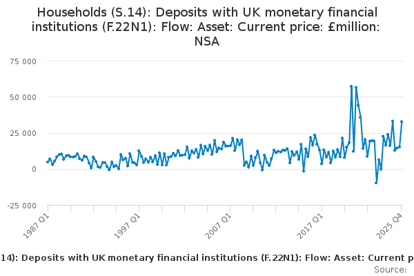 Download this time seriesHouseholds (S.14): Deposits with UK monetary financial institutions (F.22N1): Flow: Asset: Current price: £million: NSA